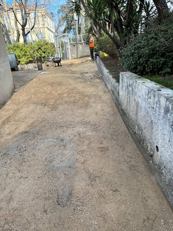 Dans un premier temps, notre équipe a reprofilé le chemin : mise à niveau et compactage du sol. Une bonne préparation du sol avant la pose de l'enrobé est essentiel pour garantir un revêtement durable.