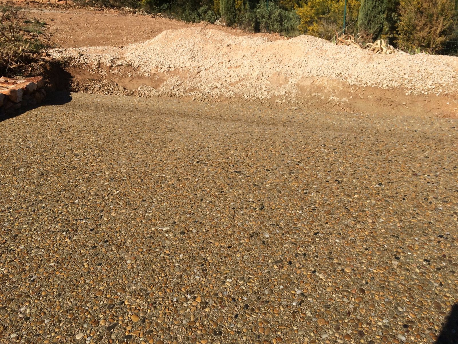 Le travail a commencé par un terrassement soigné de tout le chemin, afin d'avoir une base stable. L'ancien revêtement a été enlevé, puis on a ajouté une grave non traitée compactés pour corriger les niveaux et s'assurer que l'eau de pluie s'écoule bien. Cette étape est très importante pour que le béton désactivé dure longtemps et qu'il n'y ait pas d'eau stagnante.