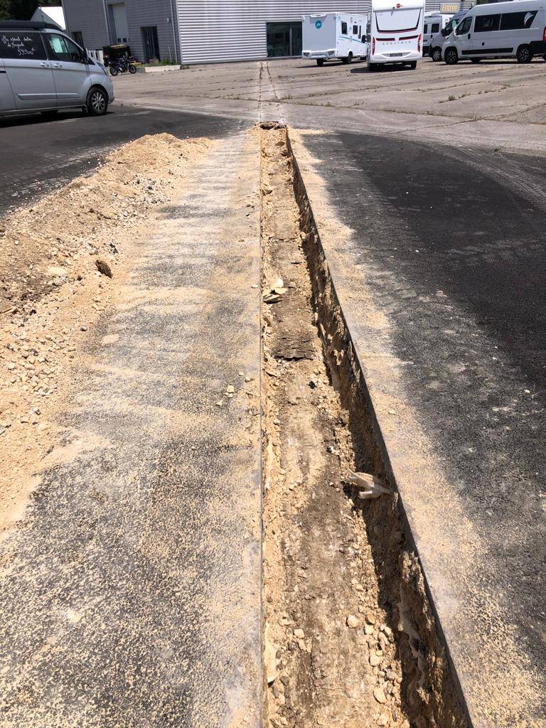 Le chantier a débuté par la découpe de l'enrobé existant afin de créer une tranchée adaptée à l'installation du nouveau réseau télécom. Cette étape, minutieuse et précise, a été réalisée par nos équipes expérimentées, assurant ainsi un résultat conforme aux normes de qualité et de sécurité.